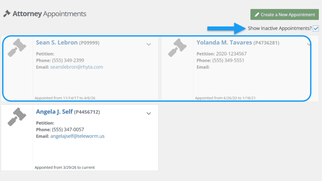 To see any past attorney appointments select the “show inactive appointments” checkbox.