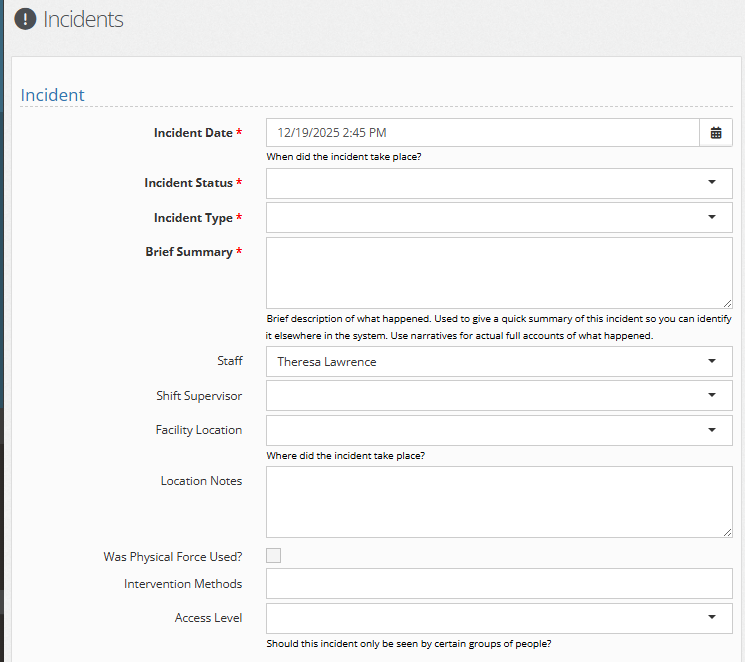 Ensure all necessary information is filled in. (At a minimum, all red asterisk fields must be completed for the incident to be saved.)