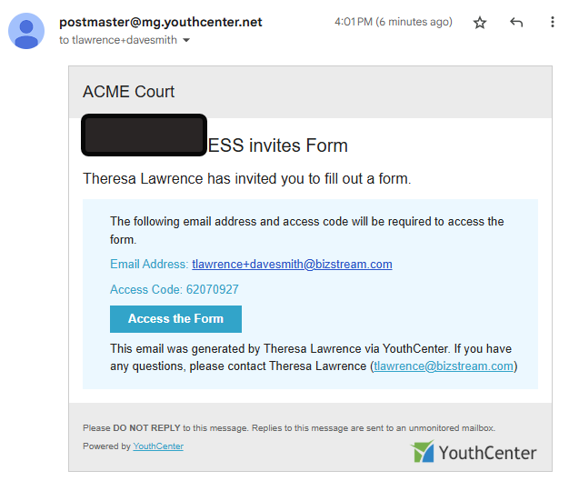 Similar to sending form invitations to a youth’s contacts to fill out via email, you can also send form invitations to a youth via email.