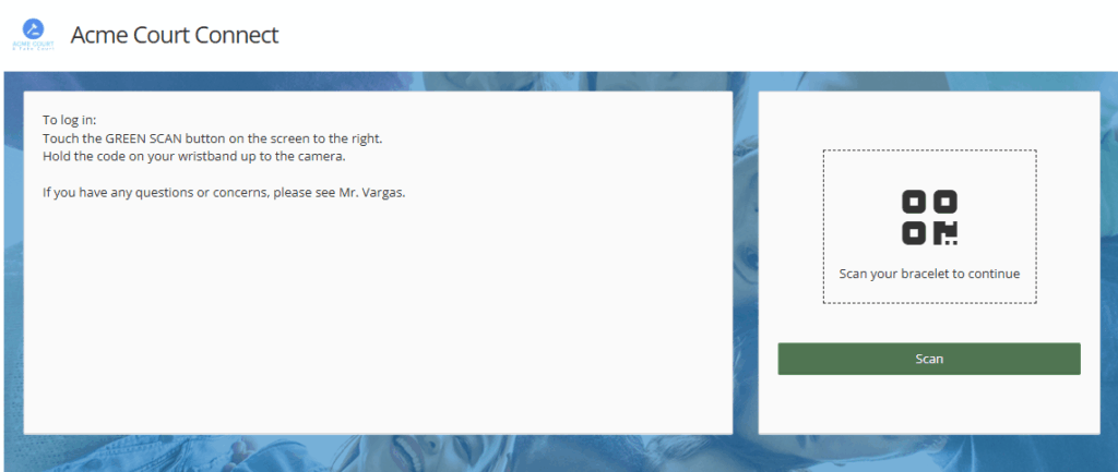 Once the youth has access to their band, they are able to utilize a kiosk, computer with a camera, phone, tablet, etc. (based on the facility’s preferences), to scan and access their individual client portal site.