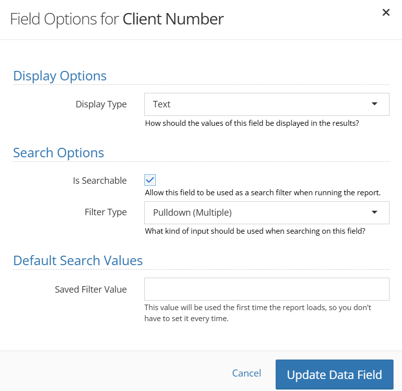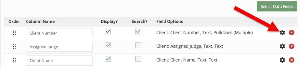 To make data fields searchable and/or to edit the filter types, select the gear icon.