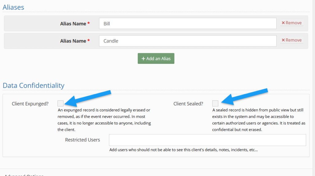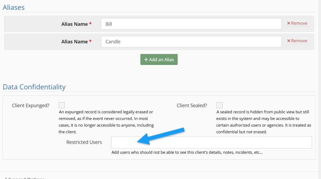 To protect a client from being reviewed by relatives/themselves, an authorized user can edit a client profile to designate individual users who are not allowed to access this client’s details. Individual users can also be added by choosing the “restricted user” box.