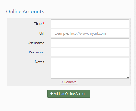 The Online Accounts Section optionally builds up a total social media presence profile of a client.